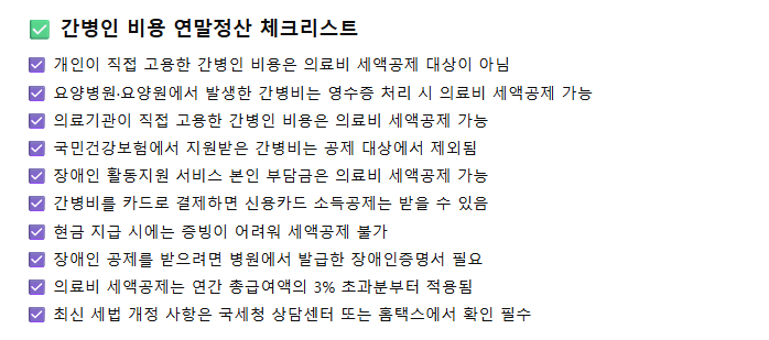 이처럼 간병비 연말정산은 단순히 지출 여부가 아니라 지출한 기관과 항목에 따라 달라지므로, 영수증과 증빙 서류를 꼼꼼히 확인하는 것이 중요합니다.