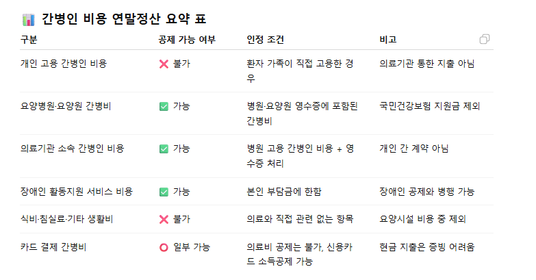 그러나 요양병원·요양원 비용이나 의료기관 소속 간병 서비스 등 일부 예외적인 경우는 공제가 가능하며,
