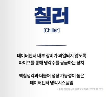 특히 냉각 기술은 데이터센터 운영에서 중요한 요소입니다. 서버는 많은 열을 발생시키기 때문에 효율적인 냉각 없이는 안정적인 운영이 불가능합니다. 최근 주목받는 방식이 액침냉각입니다. 이는 전기가 통하지 않는 특수 액체에 서버를 담가 직접 식히는 방법으로, 에너지 효율을 크게 높일 수 있습니다. 또한 칠러는 파이프를 통해 냉각수를 공급하여 서버의 발열을 줄이는 장치로, 냉각 시장에서 고성장이 기대됩니다.