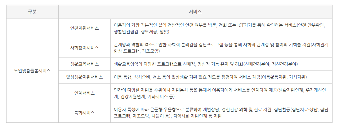 또한 독거노인의 사회적 고립을 예방하고 지역사회 자원을 연계하는 허브 역할을 수행하고 있습니다. 단순히 일상 돌봄에 국한하지 않고, 사회적·정신적·경제적 어려움을 함께 해결하는 종합지원 체계를 마련하고 있다는 점이 가장 큰 특징입니다.