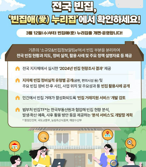 2025년 3월 12일부터 정부는 한국부동산원과 협력하여 빈집애(愛) 누리집을 전면 개편하고 운영을 시작했습니다. 이전에는 소규모&빈집정보알림e가 빈집 정보를 제공해 왔지만, 정보 접근성이 낮다는 지적이 있었습니다.
