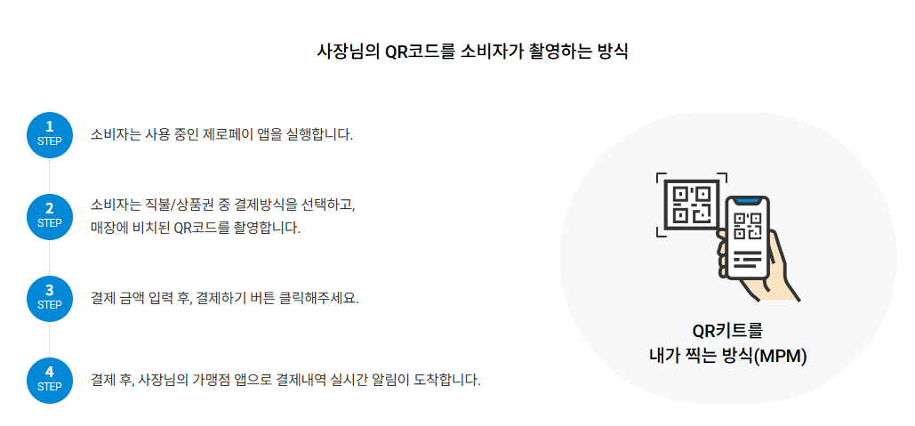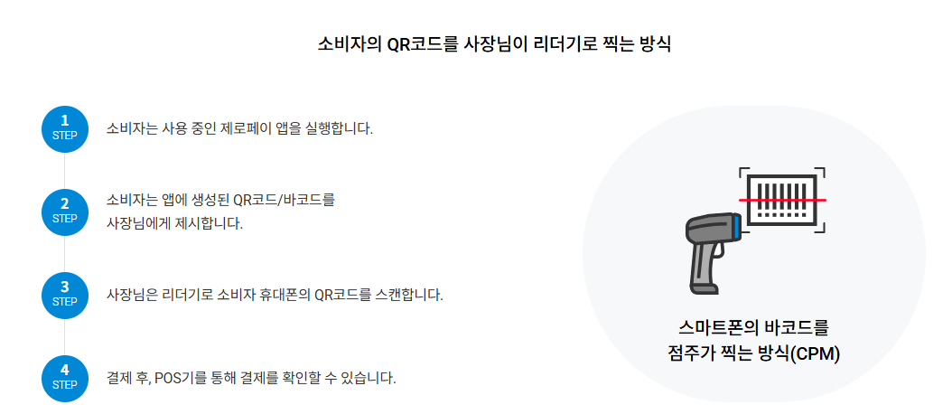 두 번째는 여러분이 앱에서 생성한 QR코드를 가맹점 사장님이 스캔해서 결제를 완료하는 방식입니다. 두 방법 모두 10초 안에 끝나는 초스피드 결제가 가능합니다.
