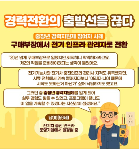 20년 이상 구매부장으로 일한 남OO(59세) 씨는 전기 기능사 자격증을 땄지만, “경력 없음”이라는 벽에 막혔습니다. 하지만 중장년 경력 지원제를 통해 전기차 충전 인프라 운영기업에서 직접 실무 경험을 하면서 자신감을 되찾고, 제2의 커리어 가능성을 확인했습니다.