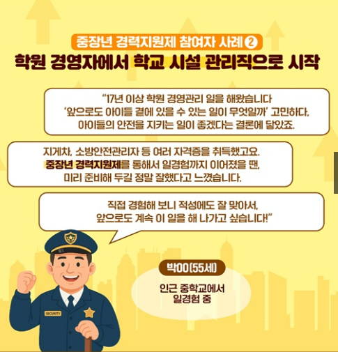 17년간 학원을 운영했던 박OO(55세) 씨는 소방안전관리자 자격증을 취득한 뒤, 학교 시설 관리직 현장에 참여했습니다. 아이들의 안전을 지키는 일을 직접 경험하면서, 자신의 적성과 잘 맞는 새로운 일자리를 찾게 되었습니다.