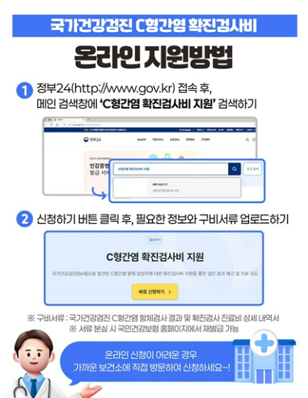 정부는 항체검사에서 양성이 나온 후 확진검사가 필요한 경우, 최초 1회에 한해 검사비와 진료비를 지원합니다. 온라인 신청은 정부24에서 C형간염 확진검사비 지원을 검색해 신청할 수 있고, 어려운 경우 보건소를 방문해도 됩니다.