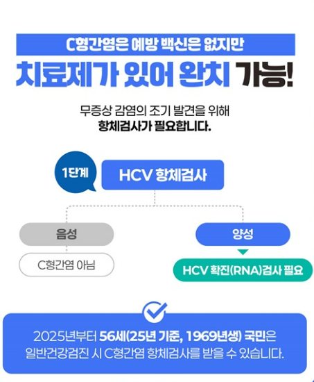 2025년부터는 56세 국민(1969년생)이 국가건강검진에서 C형간염 항체검사를 무료로 받을 수 있습니다. 조기 발견으로 예방 못지않은 건강 관리를 시작할 수 있습니다.