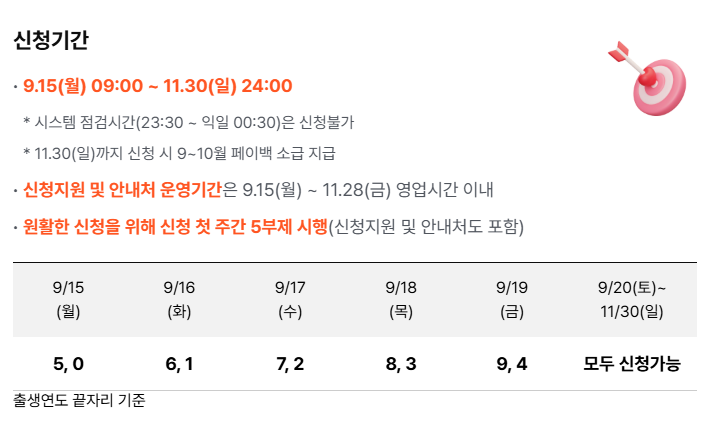 다만 첫 주에는 혼잡을 막기 위해 출생연도 끝자리에 따라 신청할 수 있는 5부제가 운영됩니다. 9월 15일에는 끝자리가 5와 0인 분들이, 16일에는 6과 1, 17일에는 7과 2, 18일에는 8과 3, 19일에는 9와 4가 신청할 수 있습니다. 9월 20일부터는 모든 대상자가 자유롭게 신청할 수 있습니다.