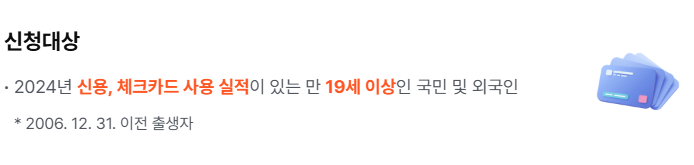 대상은 2024년 신용카드나 체크카드 사용 실적이 있는 만 19세 이상 국민입니다. 즉, 성인이라면 대부분 참여가 가능합니다. 다만, 실적이 전혀 없는 경우에는 참여할 수 없습니다. 또, 세금이나 공과금 납부, 보험료, 해외 결제, 유흥업종 사용액 등은 실적에 포함되지 않으므로 주의가 필요합니다.