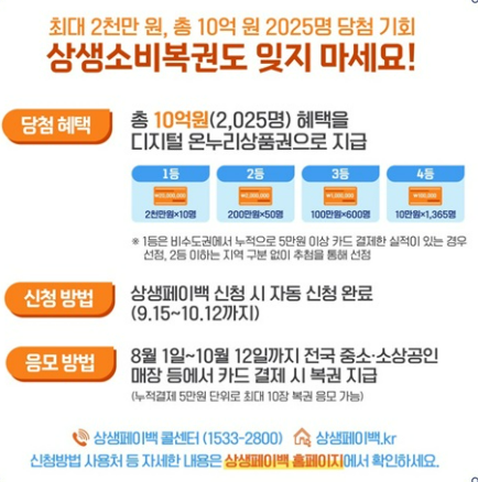상생페이백에 신청하면 자동으로 응모되는 상생소비복권도 있습니다. 이 이벤트는 총 10억 원 규모로 진행되며, 당첨자 수는 2,025명입니다. 1등은 무려 2,000만 원(10명), 2등은 200만 원(50명), 3등은 100만 원(600명), 4등은 10만 원(1,365명)입니다. 당첨금은 디지털 온누리상품권으로 지급되며, 실질적인 혜택이 매우 큽니다.