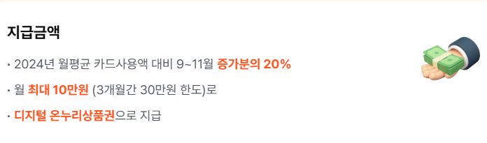 2024년 카드 사용 실적을 기준으로, 2025년 9월부터 11월까지 카드 사용액이 늘어난 만큼 일정 비율을 돌려받는 방식입니다. 증가분의 20%를 디지털 온누리상품권으로 환급해 주기 때문에, 소비가 곧 혜택으로 이어지는 구조입니다.