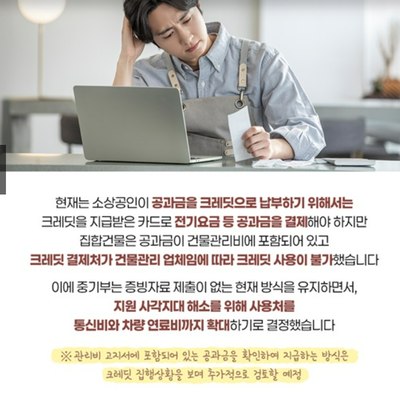 그동안 집합건물에 입주한 소상공인은 전기·가스·수도요금이 관리비에 포함돼 있어 크레딧 사용이 불가능했습니다. 결제처가 건물관리업체로 한정되어 있었기 때문입니다.