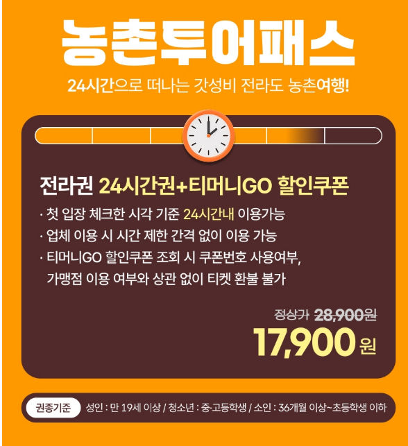농촌투어패스를 구매하면 24시간 동안 가맹 농촌체험·관광지·식음시설을 자유롭게 이용할 수 있습니다. 이 패스는 모바일티켓 형태로 발급되어 휴대폰 하나만 있으면 손쉽게 이용 가능하다는 점이 특징입니다. 더불어 농촌투어패스 구매자에게는 대중교통 할인 혜택이 제공되는데, 버스는 3,000원 한도 내에서 최대 30%, 열차는 KTX 기준 최대 50%까지 할인이 적용되어 교통비 부담을 크게 낮춰줍니다.