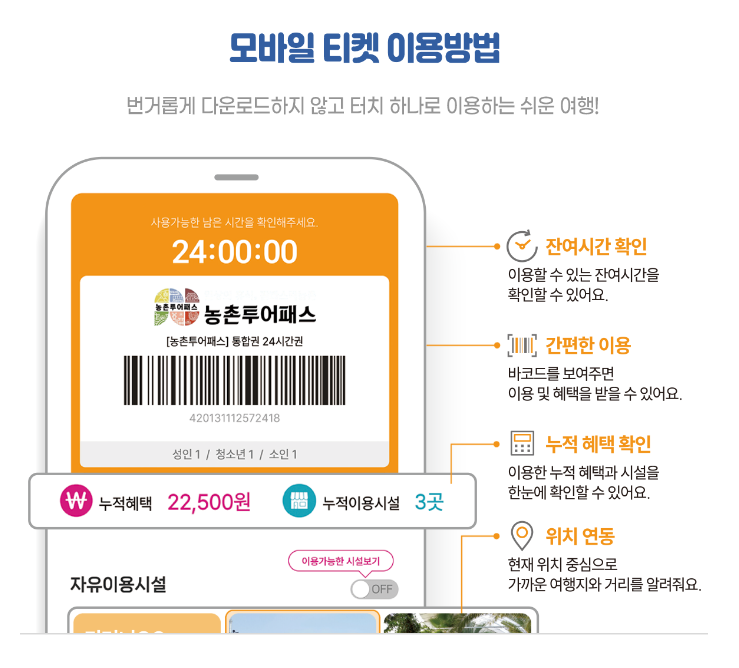 이 모바일티켓은 구매 후 즉시 발급되며, 사용자는 원하는 날짜에 패스를 활성화해 24시간 동안 사용할 수 있습니다. 패스가 적용되는 시간 동안에는 제휴된 농촌관광지와 체험 프로그램, 식당 등을 자유롭게 이용할 수 있어 여행 일정의 효율성을 높여줍니다. 또한, 사용자는 패스 앱을 통해 실시간으로 제휴 가맹점의 위치나 운영시간, 제공 서비스 등을 확인할 수 있어 여행 중에도 계획을 유동적으로 조정할 수 있습니다.