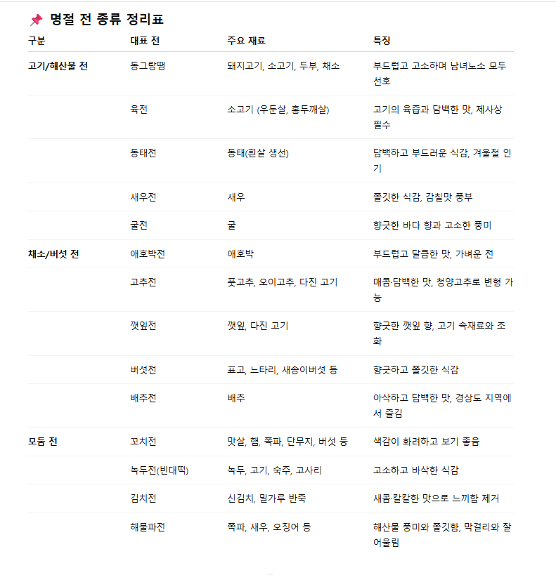 전은 단순히 부침 음식이 아니라, 각 재료의 특성을 살려 다양한 변주가 가능한 음식입니다. 그렇기 때문에 명절이 다가오면 이번에는 어떤 전을 준비할까라는 고민을 하는 가정이 많습니다.